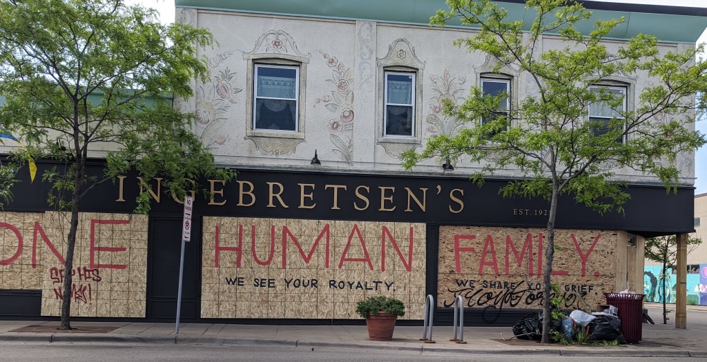 この店は初めの暴動時にガラスなどを破壊され、その後はこの様にバリケードを設置しました。そしてその板の上に「私達人類は一つの家族だ。私達はあなた達の高潔さを知っている。そして私達はあなた達の悲しみを共有している。」というメッセージを載せています。