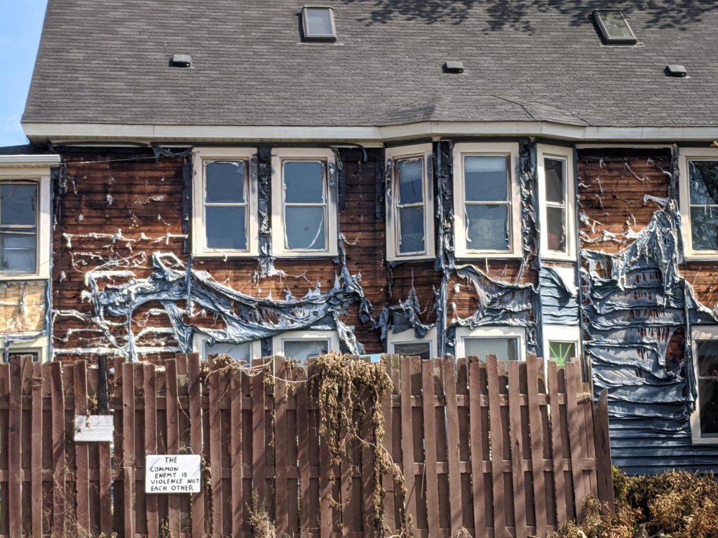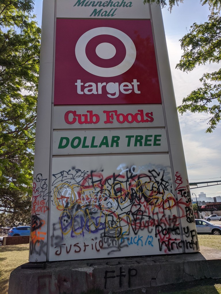 現在描かれているジョージ・フロイド氏の肖像の後ろには、Say Our Namesという言葉と共に、2016年に隣町のセントポール市で射殺された黒人フィランド・キャスタイル氏や、同年にオクラホマで殺害されたテレンス・クラッチャー氏を始めとした、フロイド氏と同じ様に丸腰にも関わらず警察の暴力の犠牲となった黒人の名前が列挙されています。