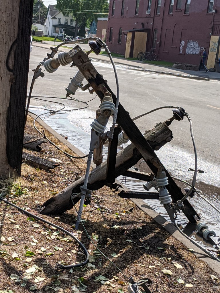 三枚目の写真は電柱が破壊された様子の写真です。これにより近隣の地域では停電が起きている可能性もあります。