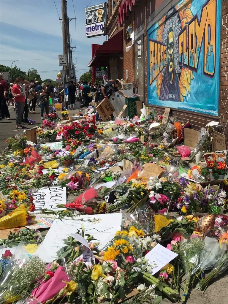 彼が殺害される前に立ち寄っていた商店の壁には、フロイド氏の肖像が描かれ、その前に数え切れない数の花束が供えられています。